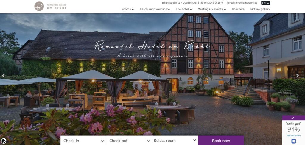 If we take a closer look at our customer, we quickly become enthusiastic about the charming idyll and the southern flair. The privately run 4-star Romantik Hotel am Brühl is located between Quedlinburg’s medieval town center and the breathtaking Brühlpark.